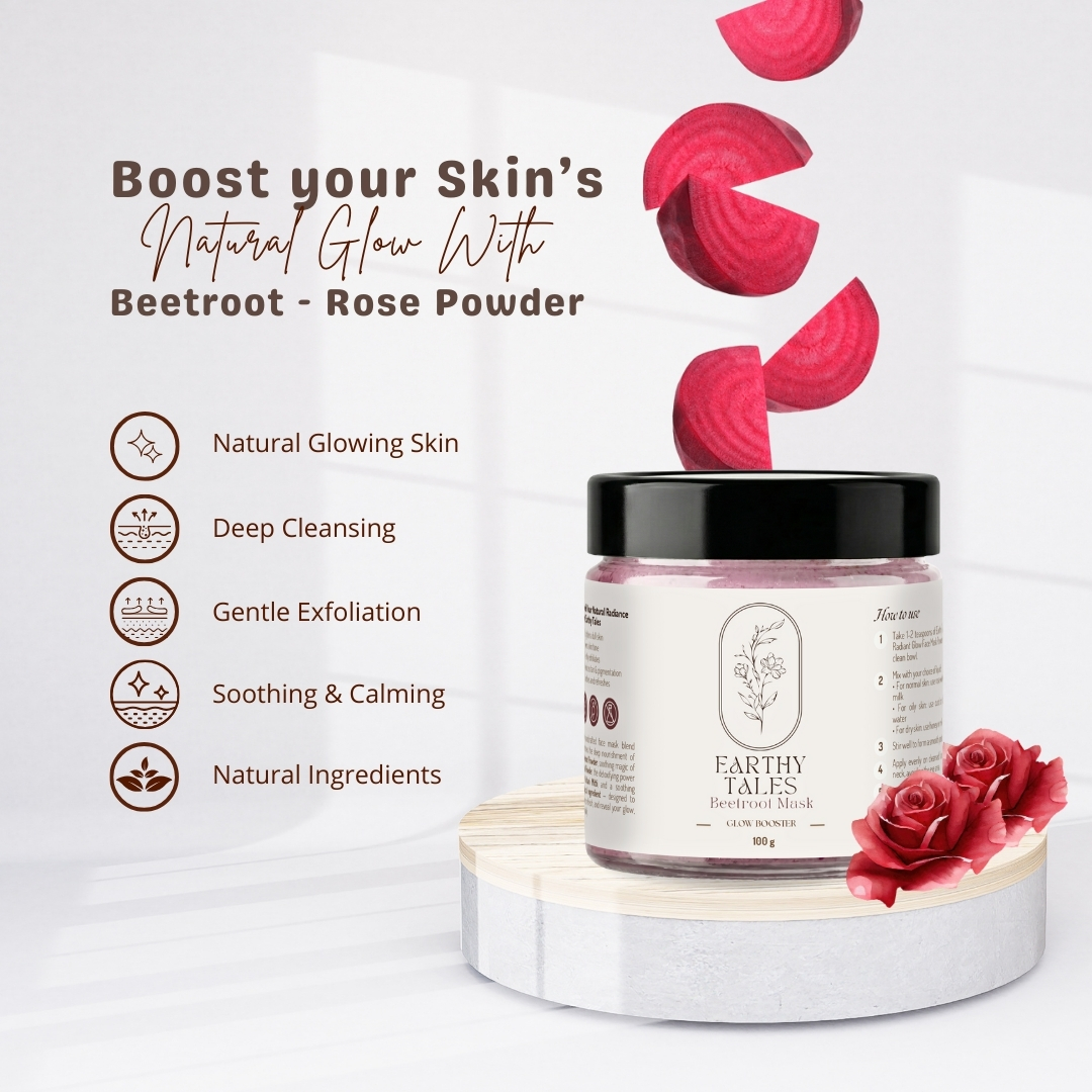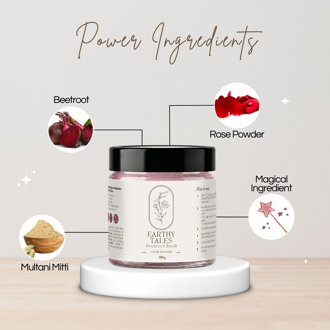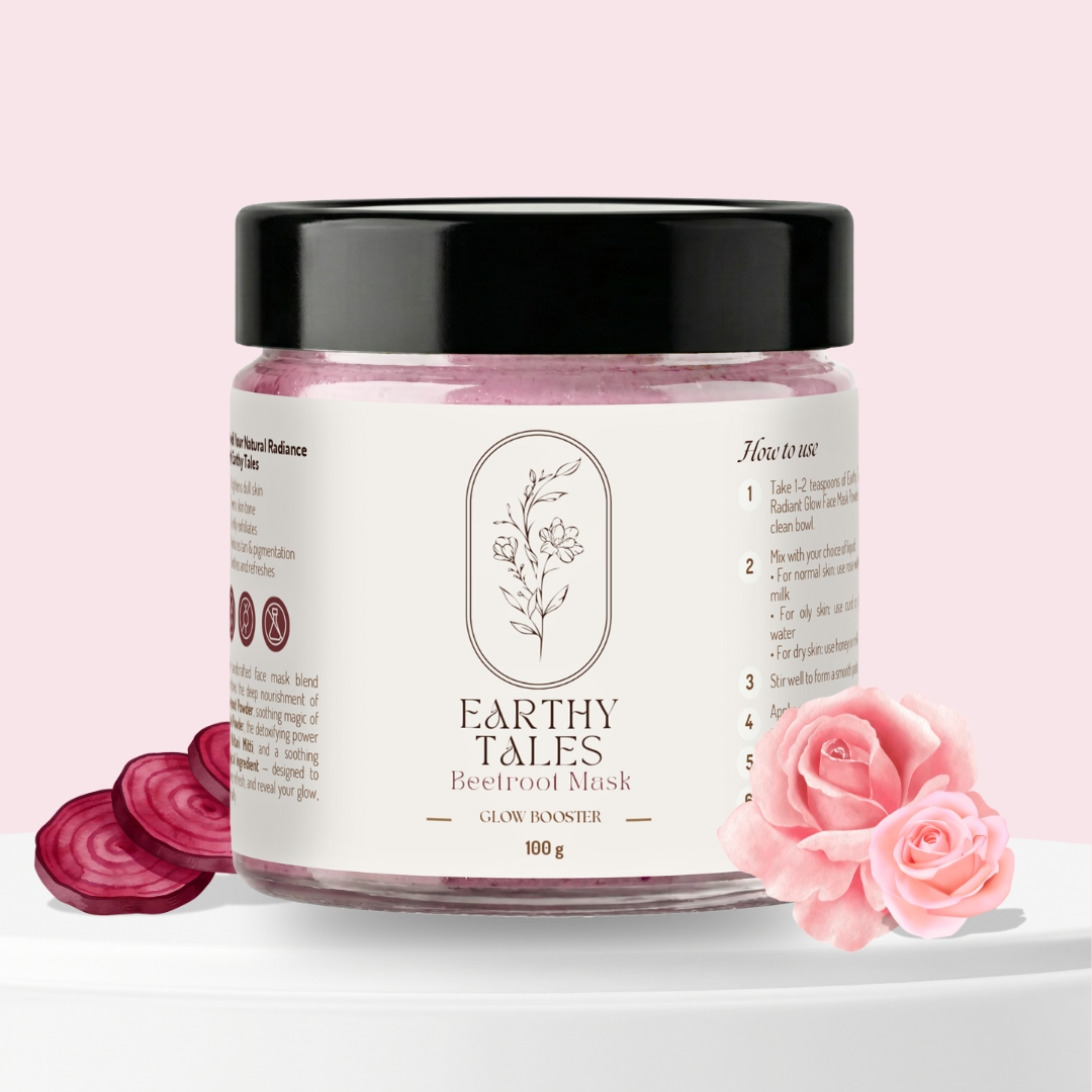 Earthy Tales is a wide range of handcrafted face mask which blend combines the deep nourishment of Beetroot Powder, soothing magic of Rose Powder, the detoxifying power of Multani Mitti, and a soothing magical ingredient — designed to revive, refresh, and reveal your glow, naturally.