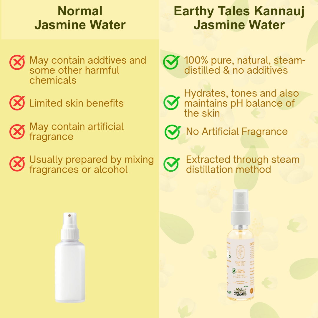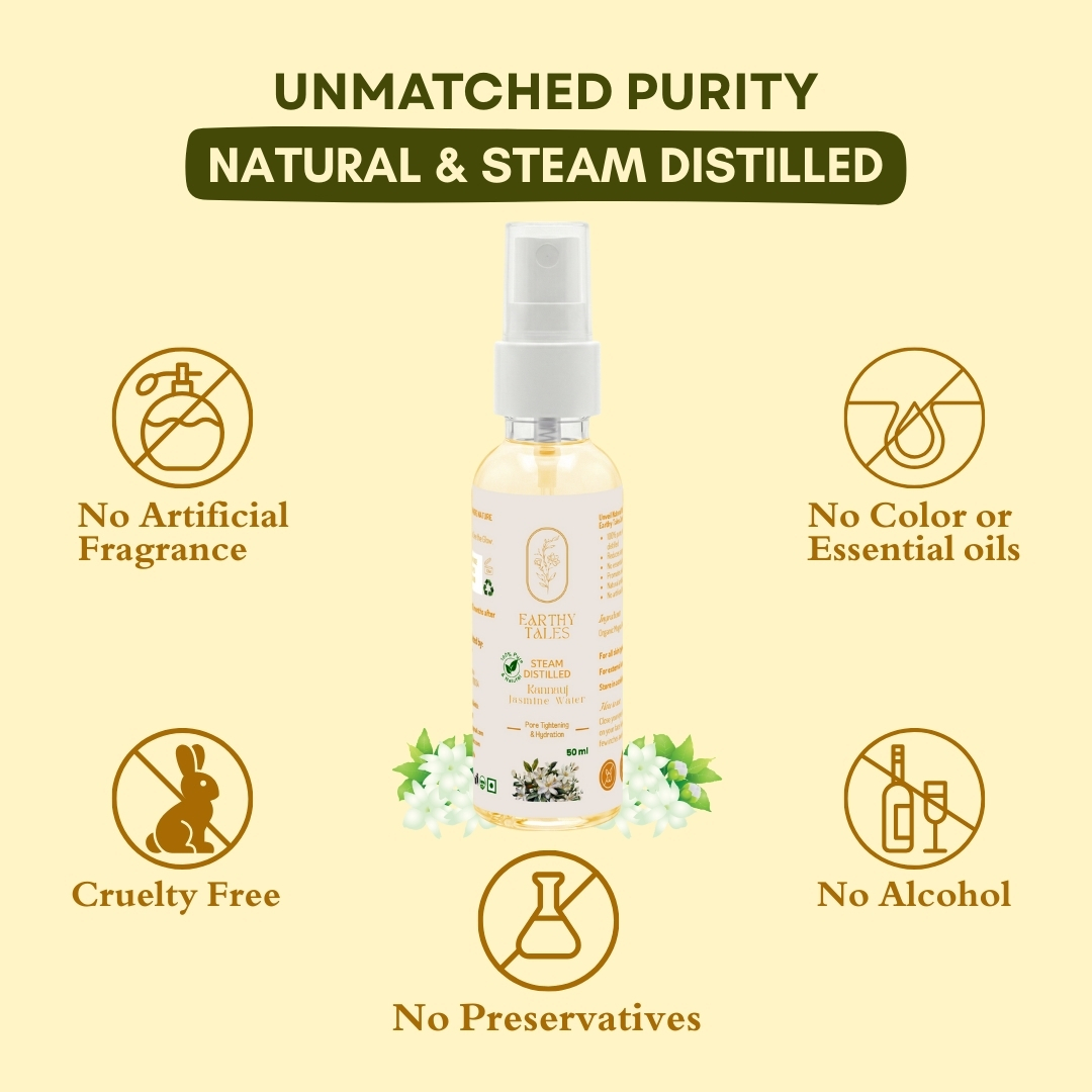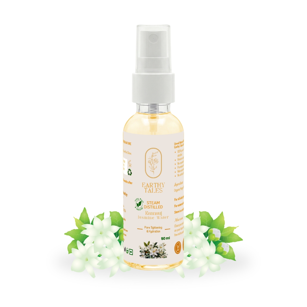 Earthy Tales Jasmine Face & Body Mist is 100% pure, natural and sourced from Kannauj, which is famous for high-quality floral waters in India. Jasmine Water is derived from the distillation of jasmine flowers. It provides natural hydration and rejuvenation for your skin. Enjoy the calming and anti-inflammatory benefits of jasmine. Absolutely free from Chemical, Preservatives and additional fragrances. Say hello to radiant and healthy complexion with our Jasmine Water.
